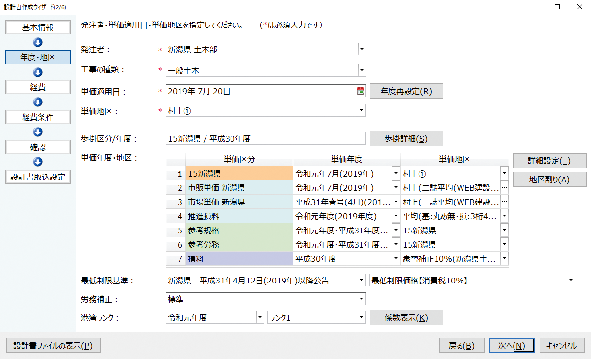 年度・地区1.単価適用日・単価地区を選択します。 総括表に「単価適用日」「単価地区」が記載されている場合は、自動で 設定されるため、再度設定する必要はありません。 |